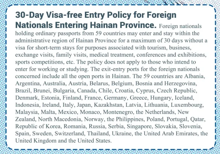 Foreign nationals holding ordinary passports from 59 countries may enter and stay within the administrative region of Hainan Province for a maximum of 30 days without a visa for short-term stays for purposes associated with tourism, business, exchange visits, family visits, medieal treatment, conferences and exhibitions, sports competitions, ete.