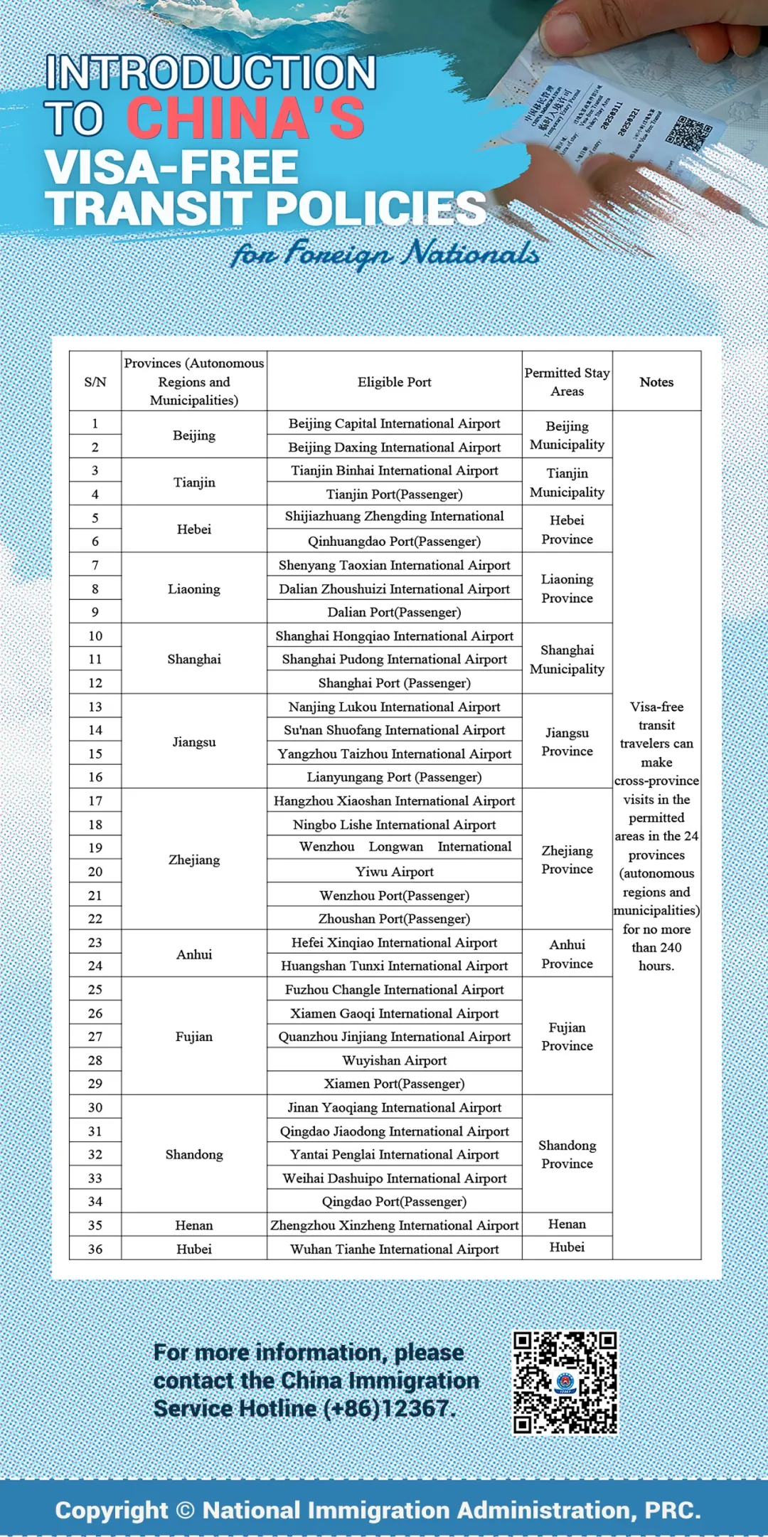 Visa-free transit travelers can make Cross-province visits in the permitted areas in the 24 provinces (autonomous regins and municipalities) for no more than 240 hours
