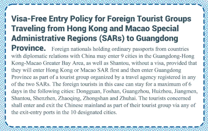 Visa-Free Entry Policy for Foreign Tourist Groups Traveling from Hong Kong and Macao Special Administrative Regions (SARs) to Guangdong Province.