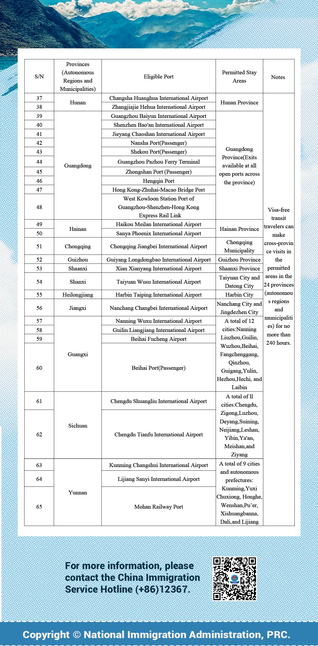Visa-free transit travelers can make Cross-province visits in the permitted areas in the 24 provinces (autonomous regins and municipalities) for no more than 240 hours