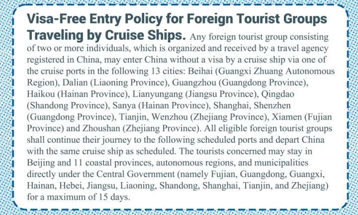 Any forcign tourist group consisting of two or more individuals, which is organized and received by a travel agency registered in China, may enter China without a visa by a cnuise ship via one of the cruise ports in the following 13 cities: